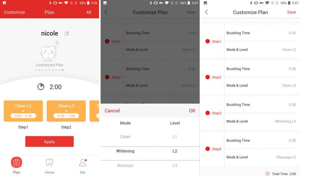 Zur zusätzlichen Anpassung eurer Putzroutine gibt es zudem drei verschiedene Reinigungsmodi: „Reinigen“, „Aufhellung“ und „Massage“. Jeder Modus verfügt außerdem über vier Intensitätsstufen. Ich verwende abwechselnd meinen benutzerdefinierten Modus und den Aufhellungsmodus. Zu Beginn des Testzeitraums fragte ich unseren Praktikanten, ob meine Zähne tatsächlich der viertdunkelsten Farbe auf der Oclean-Skala entsprechen würden und seine Antwort lautete: „Manche Leute trinken eben viel Kaffee“. Sechs Wochen später kann ich stolz behaupten, dass meine Zähne um einen ganzen Farbton weißer geworden sind.
