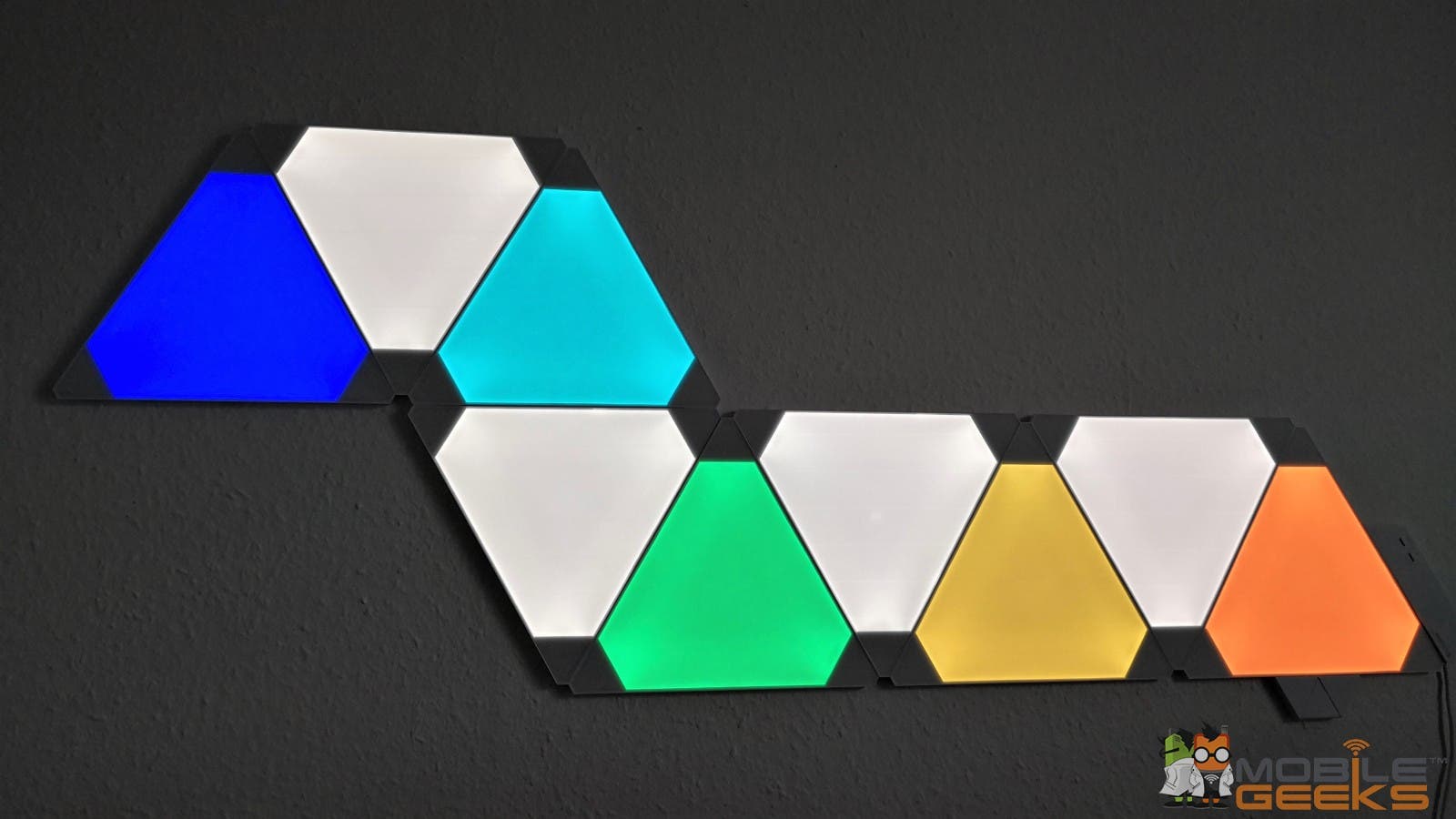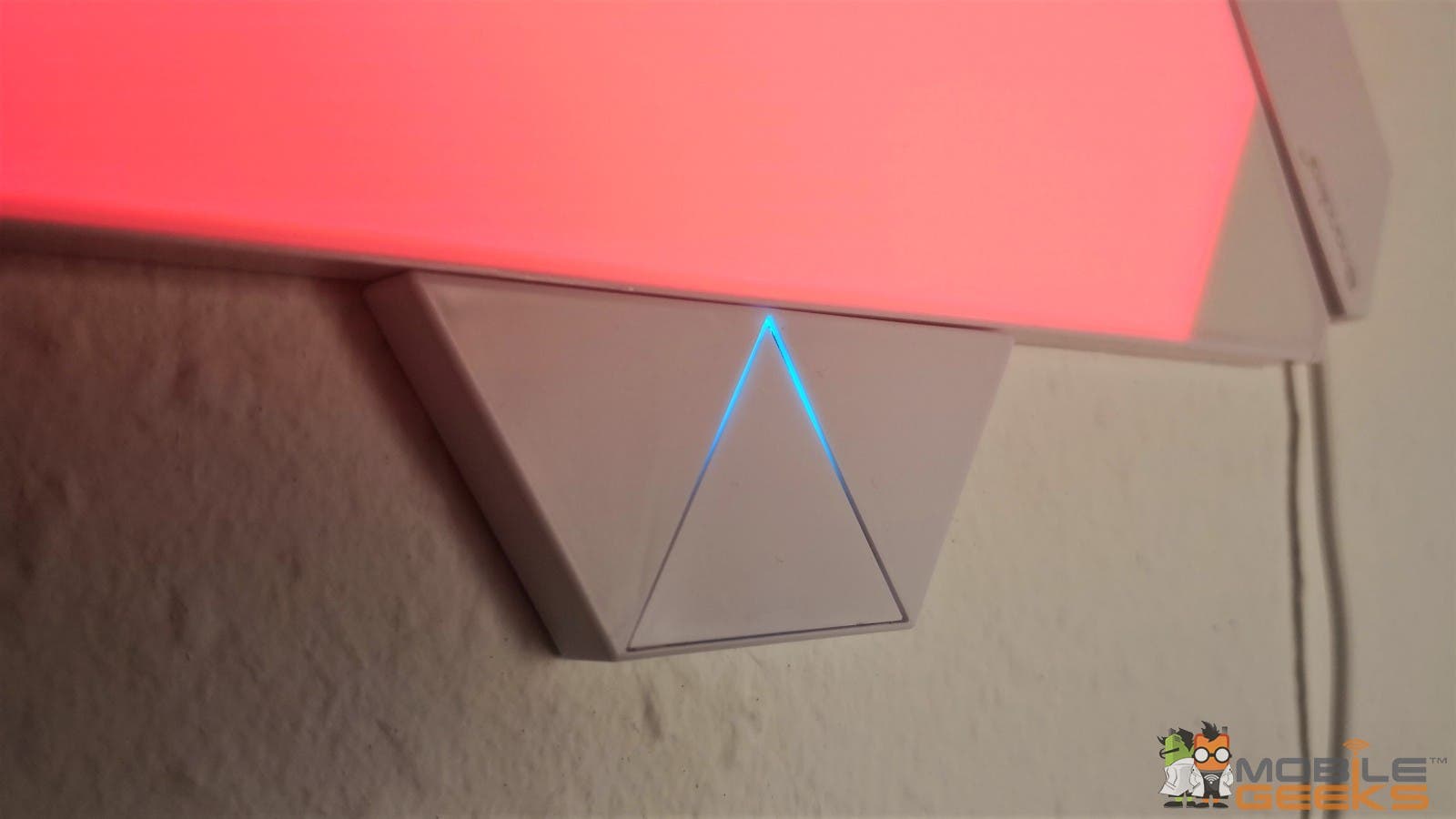 Die Installation ist dabei super einfach. Zuerst überlegt man sich welche Form das Ganze haben soll und dann setzt man sie ganz einfach zusammen. Einfach die beiliegenden doppelseitigen Klebestrips an eines der Panels kleben und dann an die Wand. Daraufhin bringt man den Verbindungschip an und das zweite mit Klebestrips bestückte Dreieck wird angeschlossen. Zuletzt wird noch das Power-Modul an die gewünschte Stelle angebracht, welches die Leuchten mit Strom versorgt.