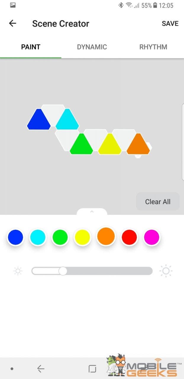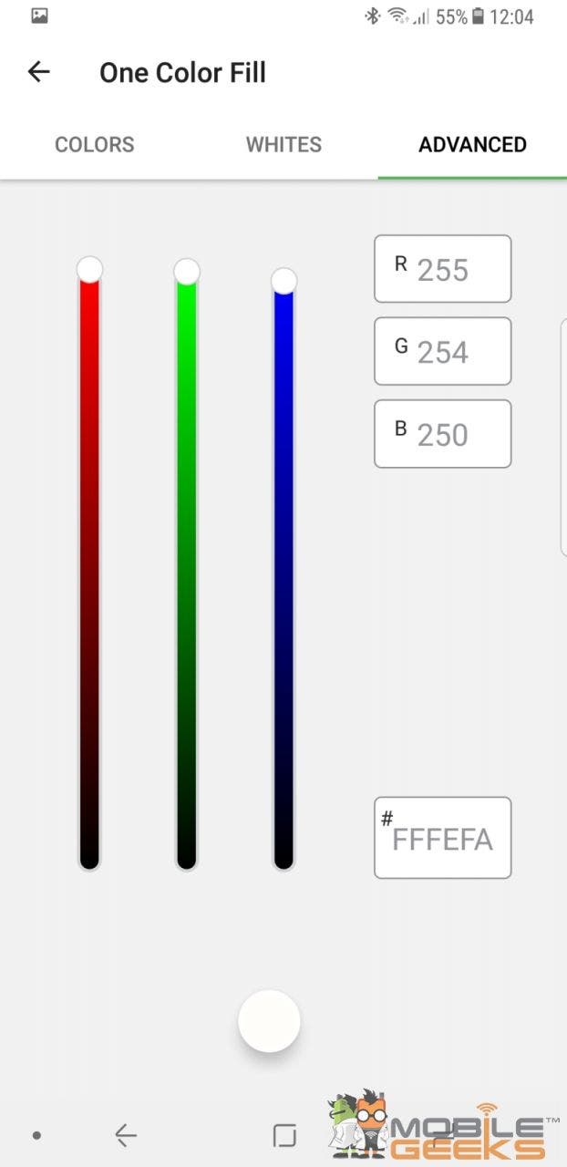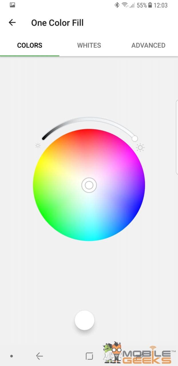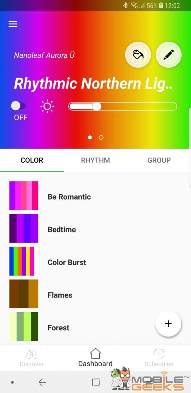 Im Colormodus lässt sich die Farbe, in der die Aurora als Ganzes oder die einzelnen Module leuchten sollen und die Helligkeit in vielen Stufen einstellen. Dabei lassen sich auch verschiedene Lichtszenen programmieren oder vordefinierte aussuchen, bzw. herunterladen. Ob es romantisch sein soll, bequemes Kaminfeuer-Feeling, Party-Leuchten, Sonnenaufgang oder Sonnenuntergang. Möglichkeiten gibt es viele.