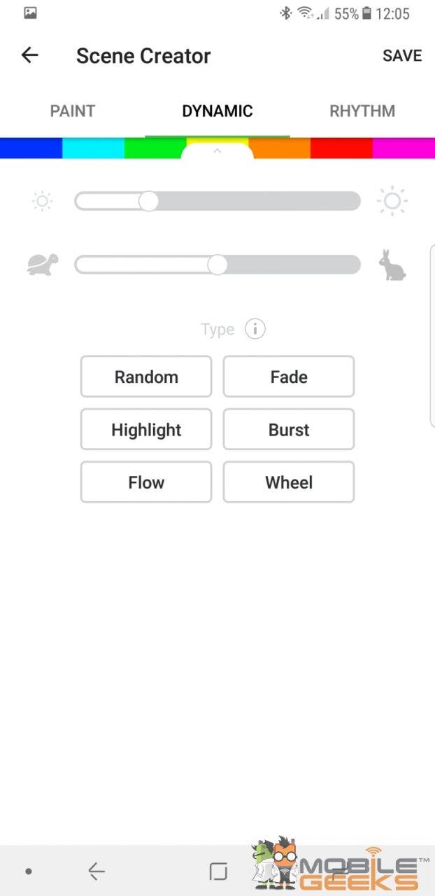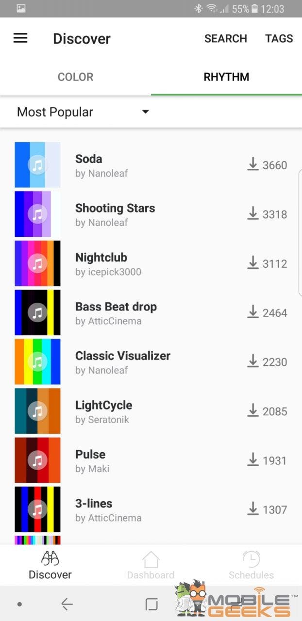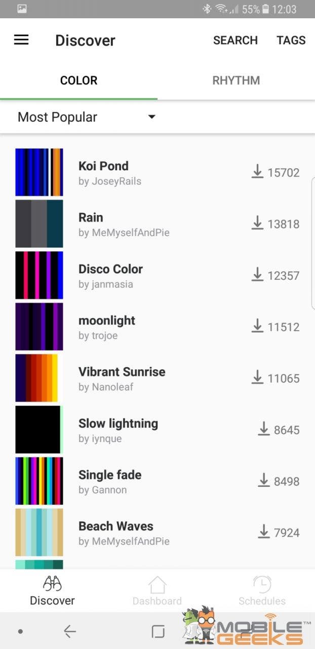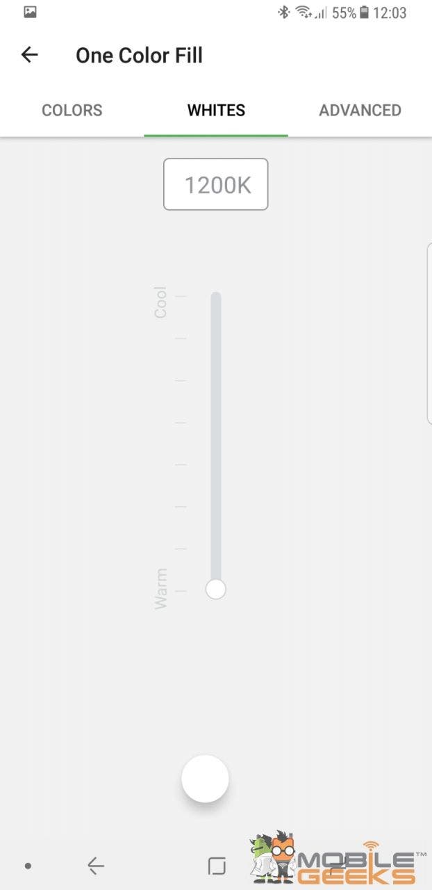 Im Colormodus lässt sich die Farbe, in der die Aurora als Ganzes oder die einzelnen Module leuchten sollen und die Helligkeit in vielen Stufen einstellen. Dabei lassen sich auch verschiedene Lichtszenen programmieren oder vordefinierte aussuchen, bzw. herunterladen. Ob es romantisch sein soll, bequemes Kaminfeuer-Feeling, Party-Leuchten, Sonnenaufgang oder Sonnenuntergang. Möglichkeiten gibt es viele.