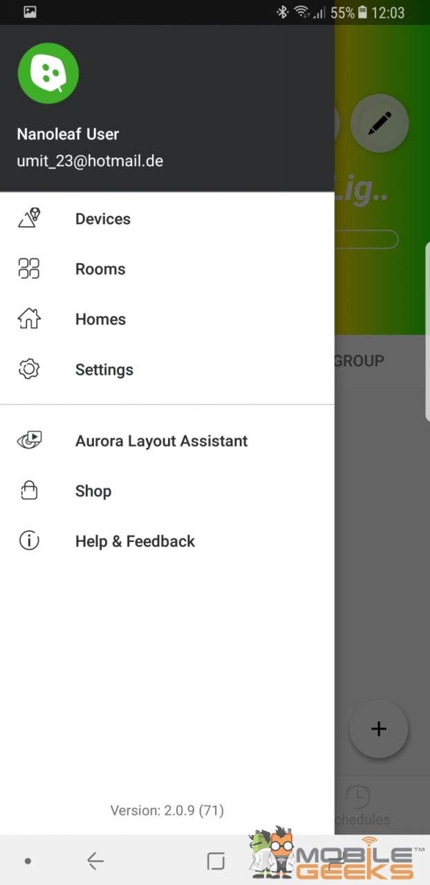 Nach dem Anschließen muss die Nanoleaf Aurora mit dem WLAN verbunden werden. Dazu muss man die dazugehörige App herunterladen. Nachdem das ganze konfiguriert ist, hat man hier mehrere Möglichkeiten, die Nanoleaf Aurora einzustellen und zu nutzen. Zum einen kann man Geräte, Räume und mehrere Häuser oder Wohnungen managen, zum anderen den Leuchtmodus der Aurora einstellen.