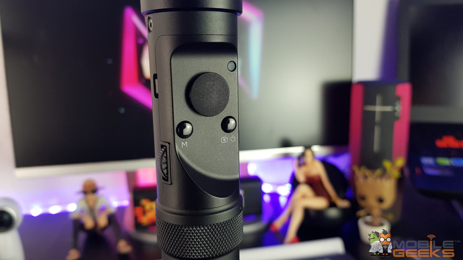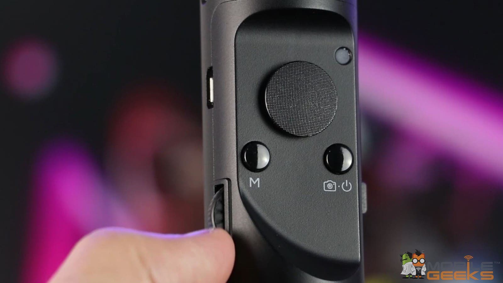 Weiter oben sind die Bedienelemente: Ein-/Austaste, Modustaste, Funktionstaste, Joystick, Steuerrad, Batterieanzeige, Ladeanzeige und zwei microUSB-Ports. Was man damit machen kann erzähle ich später. Dass die Batterieanzeige den aktuellen Batteriestatus anzeigt und die Ladeanzeige den Ladestatus sollte klar sein.