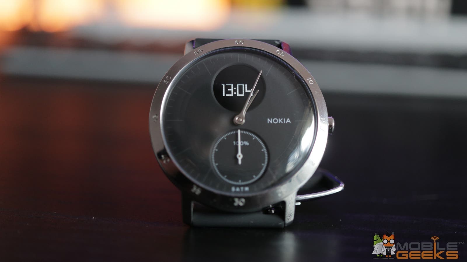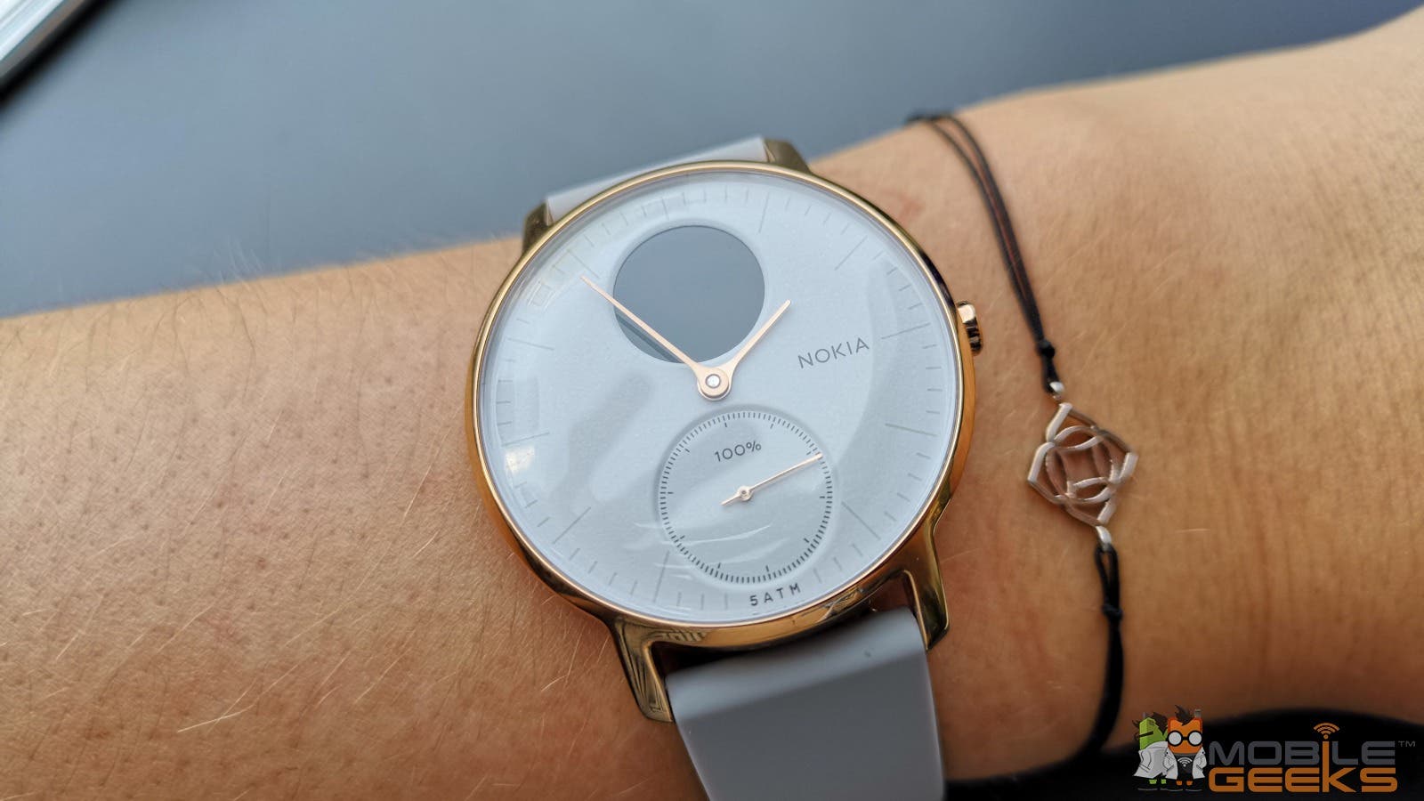 Das Design der Nokia Steel HR ist sehr klassisch gehalten und erinnert natürlich an die alten Withings-Uhren, die jetzt schon seit einiger Zeit der Health Sparte von Nokia gehören. Es sieht aus wie eine klassische analoge Uhr ohne Sekundenzeiger, aber dafür mit einem kleinen runden Display im Inneren und einer weiteren analogen Anzeige, die den Fortschritt des Schrittziels in Prozent anzeigt.