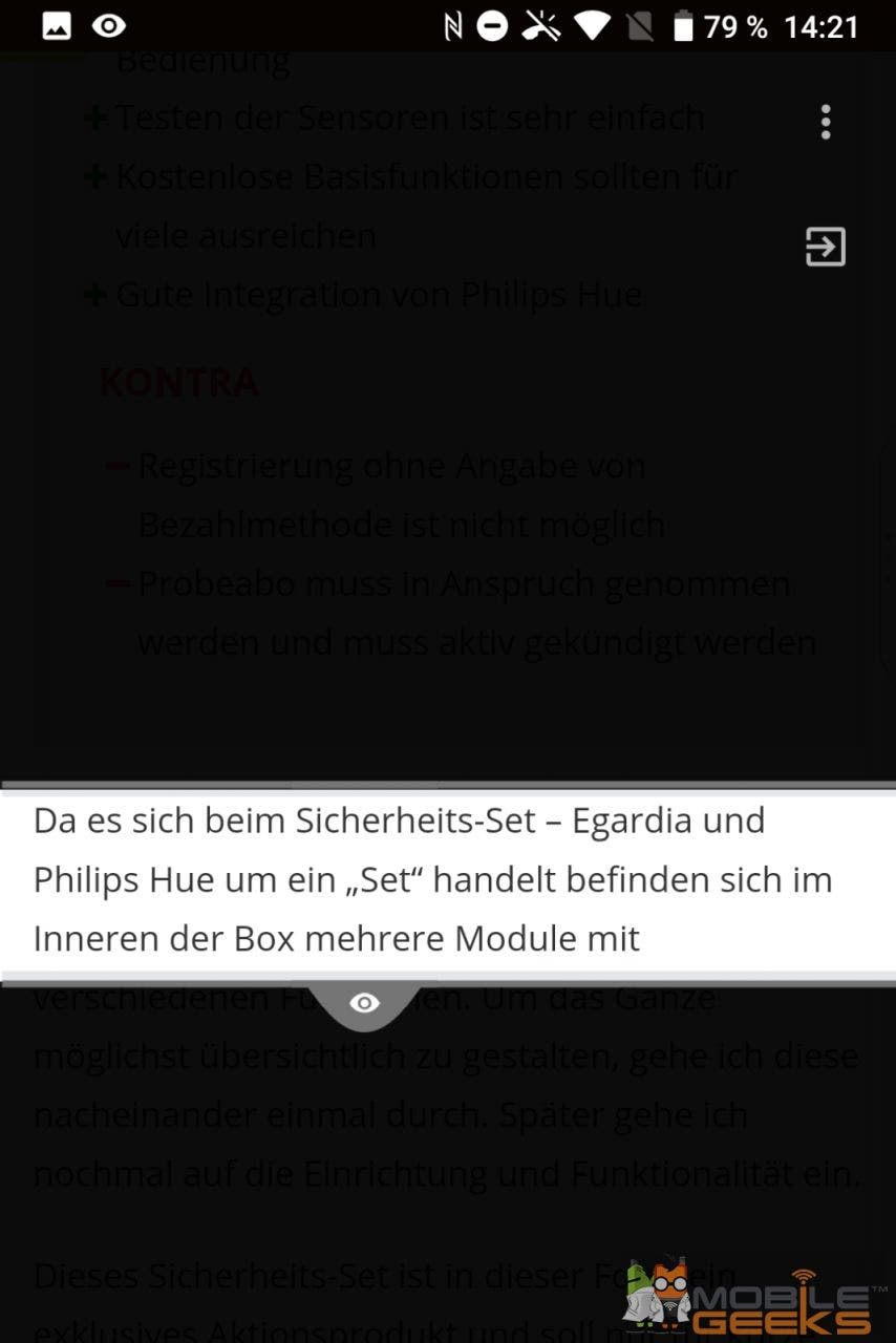 Für den Fall, dass man ein wichtiges Dokument oder eine wichtige Nachricht lesen will, aber der Sitznachbar meint rüberschielen zu müssen, gibt es die Möglichkeit den Großteil des Displays zu schwärzen und nur durch ein kleines Fenster sichtbar zu machen, welches beweglich ist. Dabei kann man das Smartphone ganz normal bedienen und steuern, nur dass der sichtbare Bereich eingeschränkt ist. Auch hat man die Möglichkeit hier nach dem Aufnehmen von Screenshots Details in Bildern einfach zu schwärzen ohne einfach zu „malen“, falls man vorhat bspw. einem Kunden etwas weiterzuleiten ohne alle Informationen offen zu legen. Wer mit Geschäftskunden arbeitet, wird sich über die Möglichkeit Visitenkarten mit der Kamera-App zu scannen und Daten abzuspeichern.