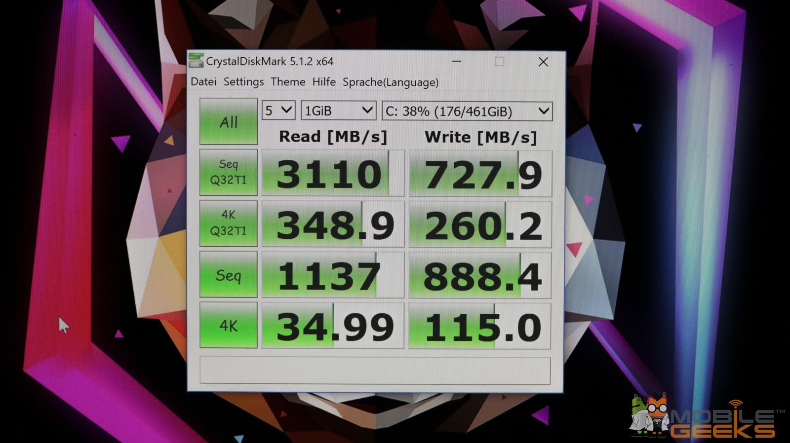 - Farbe: 100% sRGB, gemessen: 95% sRGB, 64% AdobeRGB