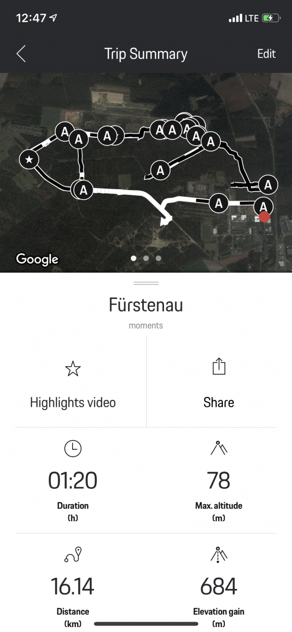 Wenn ihr eure Fahrt absolviert habt, könnt ihr euch so sehr schnell im integrierten Editor ein Highlight-Video erstellen. Dafür müsst ihr nur die Momente auswählen, einfügen, trimmen, vielleicht noch ein paar Bilder, die ihr währenddessen mit einem anderem Gerät gemacht habt, mit einfügen und heraus kommt ein fertiges Video mit bis zu 1:30 min Länge, das zum Teilen bereit ist.
