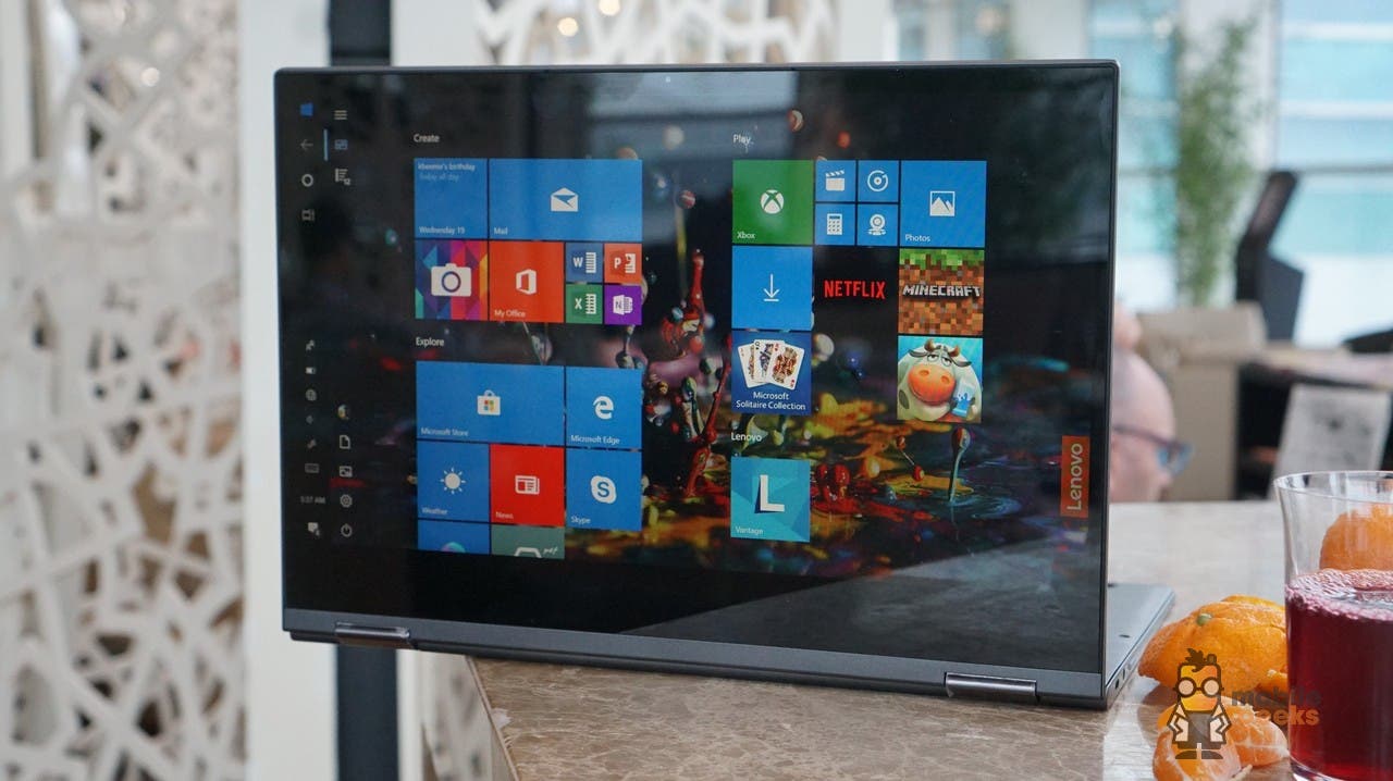 Die flexiblen Scharniere lassen sich um 360 Grad drehen und ähneln denen des ursprünglichen Lenovo Yoga. Sie sind zweistufig und obwohl sie zum Öffnen nicht viel Kraft erfordern, bieten sie auch im Tablet-Modus guten Halt, sodass ihr problemlos auf das Display tippen könnt. Was mir an diesem Formfaktor am besten gefällt: ich kann Netflix schauen, ohne die Tastatur sehen zu müssen. Den Arbeitsaspekt dieses Geräts ausblenden zu können, ist mir persönlich sehr wichtig.