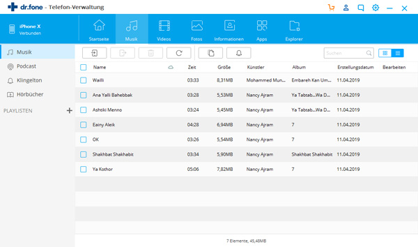 3) Wählst du im Reiter oben „Musik“ aus, listet dir Dr.Fone nun alle Musik-Dateien im Detail auf.