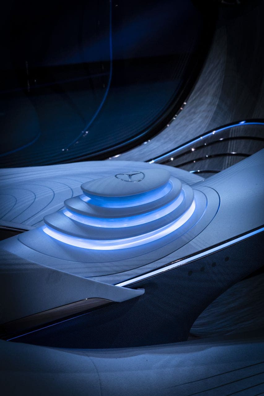 Neuartige Steuerung und biometrische Verbindung: Ein weiteres Highlight des VISION AVTR ist seine Control Unit. Das multifunktionale Bedienelement in der Mittelkonsole lässt den Fahrer das Fahrzeug durch einfaches Auflegen der Hand intuitiv steuern – sofern er nicht autonom reisen möchte. Der neuartige Antrieb ermöglicht in Kombination mit der Achsenanordnung nicht nur Bewegung nach vorne und hinten, sondern auch diagonal. So kann sich das VISION AVTR im Gegensatz zu herkömmlichen Fahrzeugen um ca. 30 Grad seitwärts fortbewegen. Der sogenannte „Krebsgang“ gibt dem Konzeptfahrzeug auch in seiner Fortbewegung eine reptilienartige Anmutung und eine hohe Agilität.
