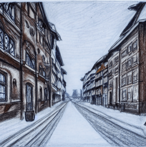 Und das Beste: Du kannst den Canva AI Image Generator kostenlos nutzen. Direkt in deinem Canva-Account findest du auf der linken Seite den Bereich „Text to Image“. Hier gibst du deinen Text ein, wählst den Stil deines Bildes aus und lässt deine Bilder erzeugen. Wir haben das Tool mit dem Text „Stadt im Schnee“ befüllt und uns für eine Zeichnung entschieden. Das ist das Ergebnis: