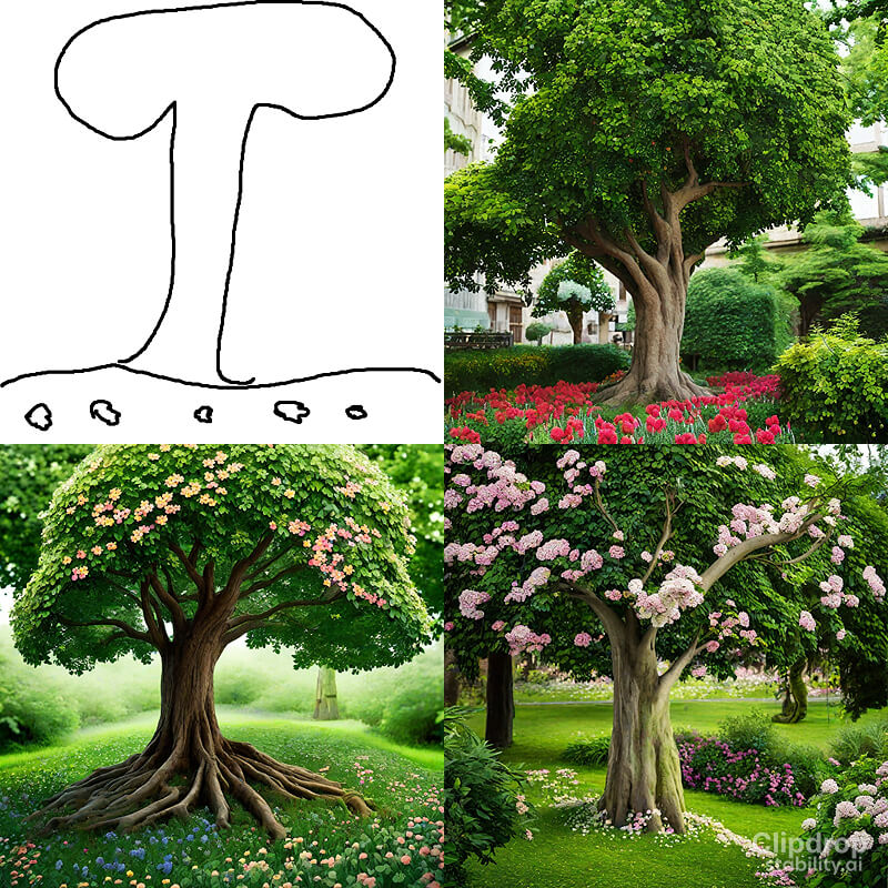 Die Ergebnisse der bereits veröffentlichten Version sind durchaus beeindruckend. Aus einem unförmigen Baum und dem oben genannten Kontext erstellt das Tool fast schon märchenhafte Motive eines Baums auf einer Blumenwiese. Möglich macht das eine KI-Software, die das Unternehmen „Stable Diffusion XL“ getaufte hat.