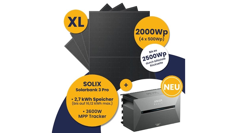 Nur während der Black Week ab dem 20. November 2025 erhältlich. Sicher‘ dir jetzt ein leistungsstarkes QUATTRO XL 2000Wp-Set mit Anker Solarbank 3 Pro von Kleines Kraftwerk inklusive Premium-Zubehör. Der Preis: Nur 1.149 Euro. Maximiere ab sofort deine Stromersparnis und hole dir jetzt das beste Balkonkraftwerk auf dem Markt – nur solange der Vorrat reicht!