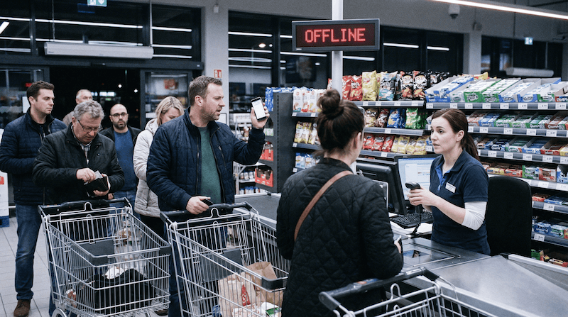 Im Rathaus sind die Terminals schwarz. Keine Behörde kann Anträge bearbeiten, keine Kasse Zahlungen verbuchen. Bürger stehen ratlos vor den Schaltern, Mitarbeiter starren auf Bildschirme, die nichts mehr anzeigen. Die regionale Sparkasse meldet: „Onlinebanking derzeit nicht erreichbar.“ Kartenlesegeräte im Einzelhandel verweigern den Dienst, Bargeld wird knapp.