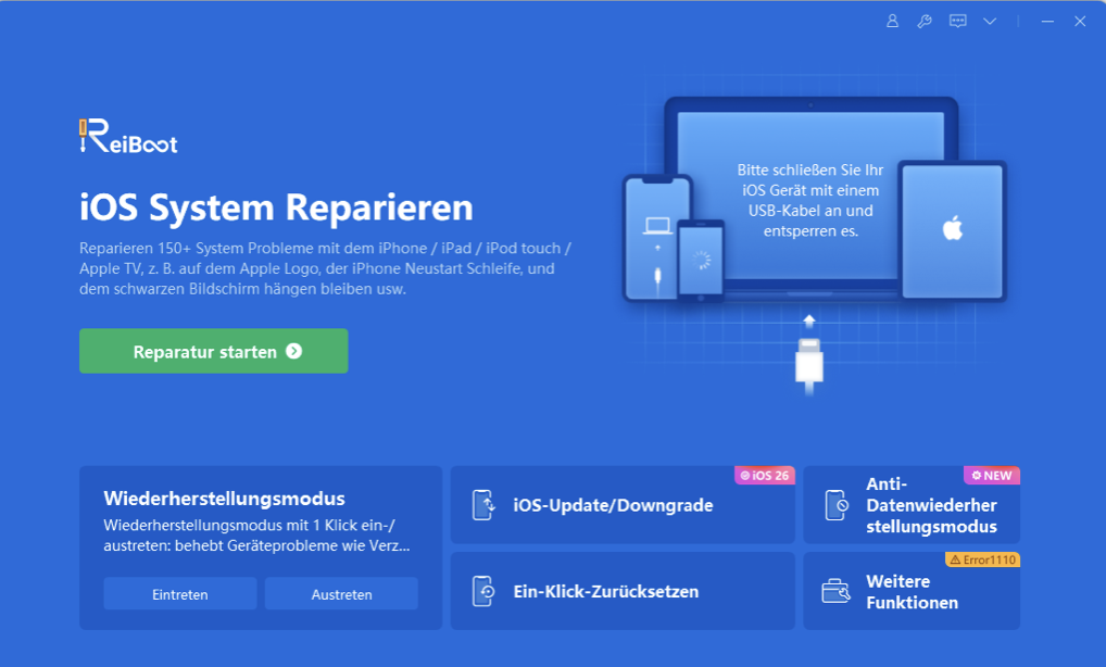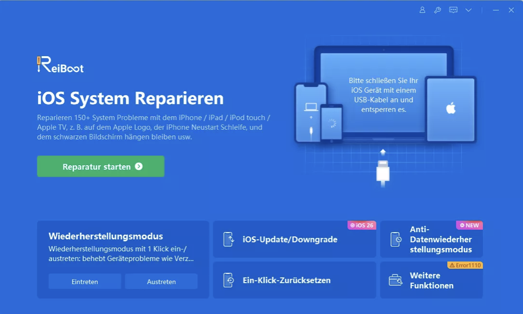 Über das reine Verlassen des Recovery Modus hinaus bietet ReiBoot zusätzliche Funktionen zur Reparatur häufiger iOS Systemfehler. Diese sind besonders relevant, wenn das iPhone zwar erkannt wird, jedoch nicht mehr korrekt startet.