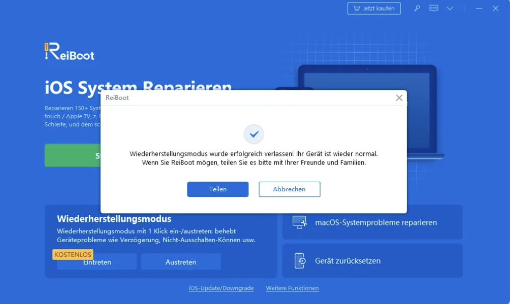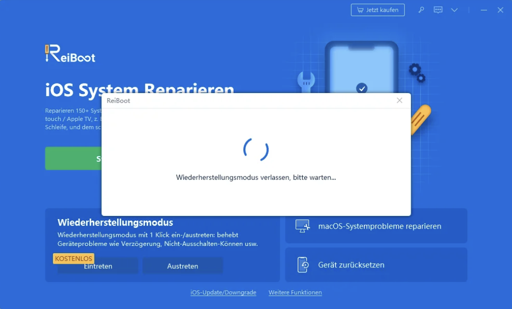 Eine der Kernfunktionen von ReiBoot ist das kontrollierte Verlassen des Wiederherstellungsmodus ohne Neuinstallation von iOS.