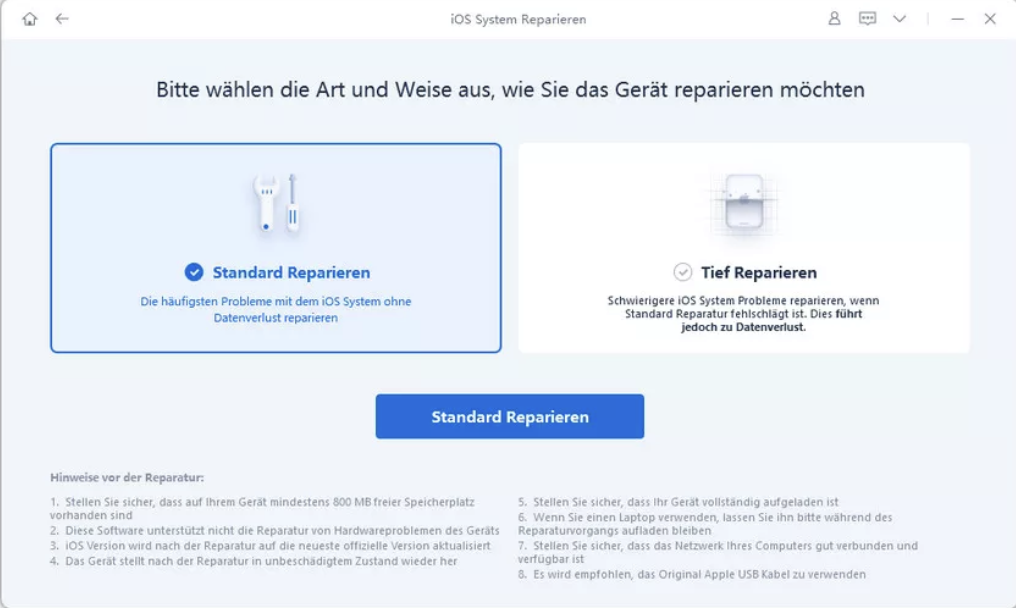 - Sobald ReiBoot dein iPhone erkannt hat, wähle die Option Standardreparatur und klicke auf Weiter, um den Reparaturvorgang vorzubereiten.