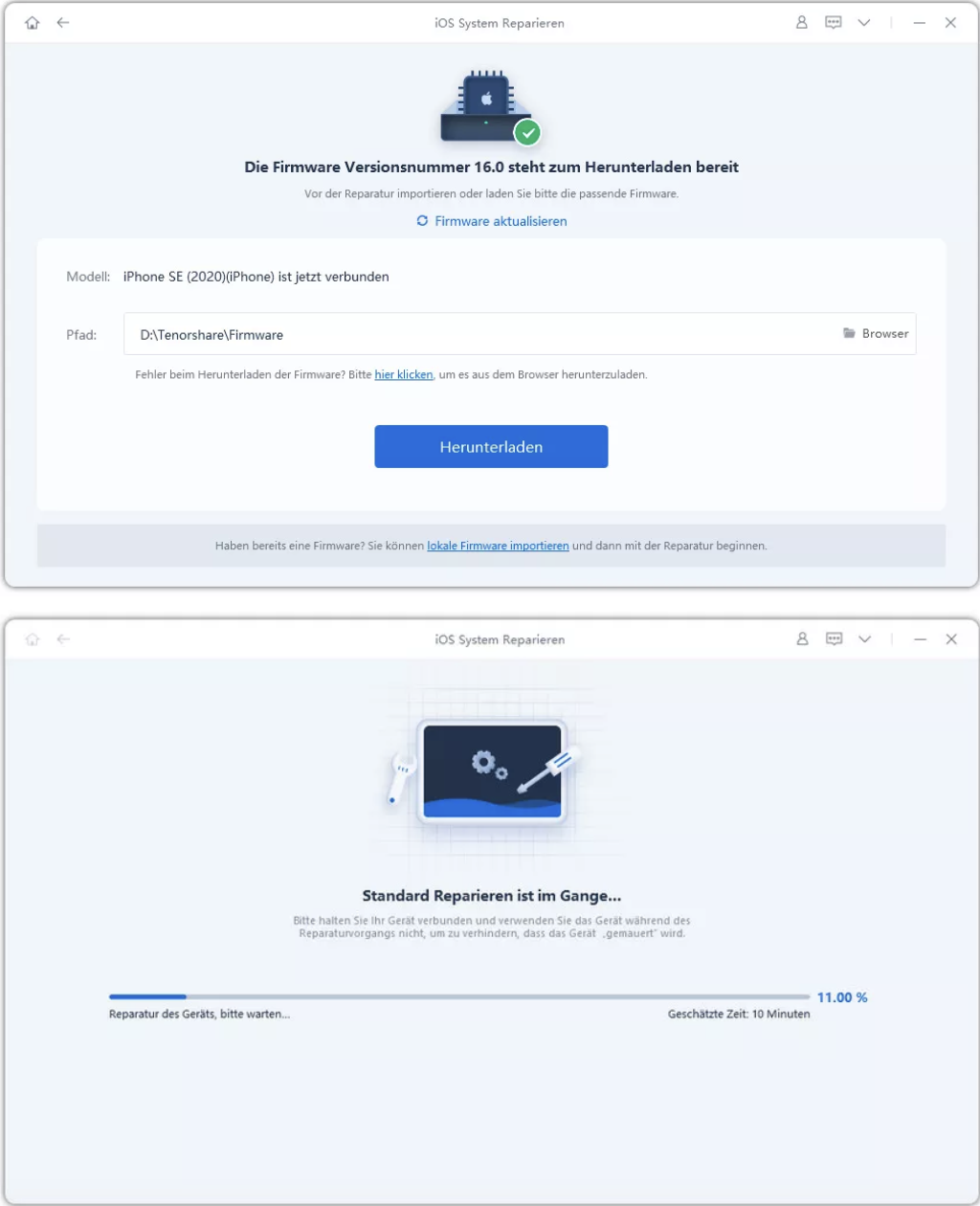 - ReiBoot erkennt automatisch das passende iOS System und fordert dich auf, das erforderliche Firmware Paket herunterzuladen. Klicke auf Download und warte, bis der Vorgang abgeschlossen ist.