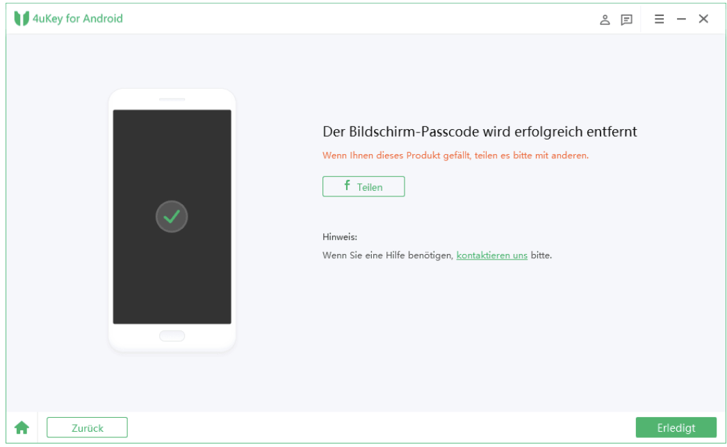 - Wenn die Bildschirmsperre erfolgreich entfernt wurde, klicken Sie auf die Schaltfläche „Fertig“, trennen Sie Ihr Telefon vom Computer und richten Sie es von Grund auf neu ein.