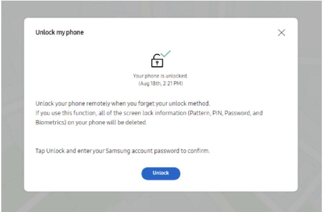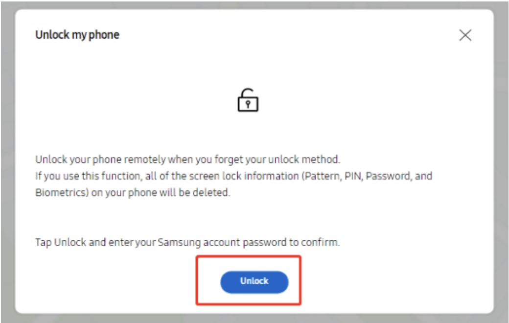 - Bestätigen Sie den Vorgang erneut, indem Sie nochmals auf „Entsperren“ klicken und zur Sicherheit das Passwort Ihres Samsung-Kontos eingeben.