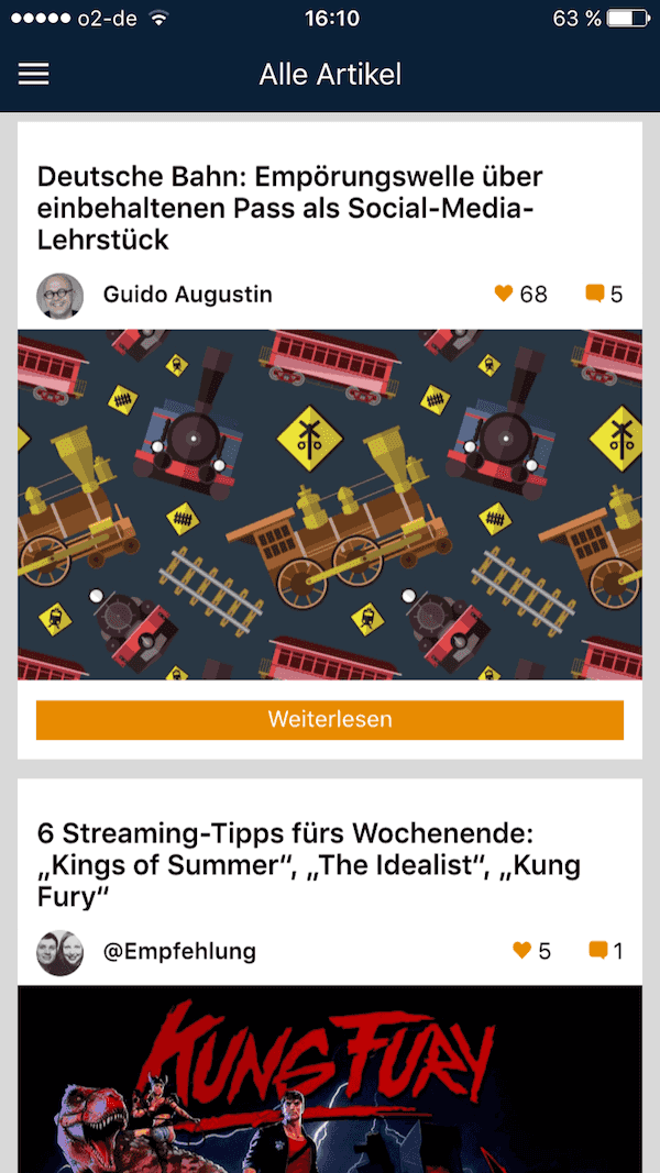 In einer Kolumne und somit in ständigem Austausch mit euch hat unser Entwickler Dennis Hüggenberg über die vergangenen Monate stetig am Projekt Smartphone-App gearbeitet, Designs vorgeschlagen, ausprobiert, verworfen und neu gemacht. Schau mal auf seiner Website und seinem Twitter-Kanal vorbei und vernetze dich mit ihm – es wird sich lohnen!